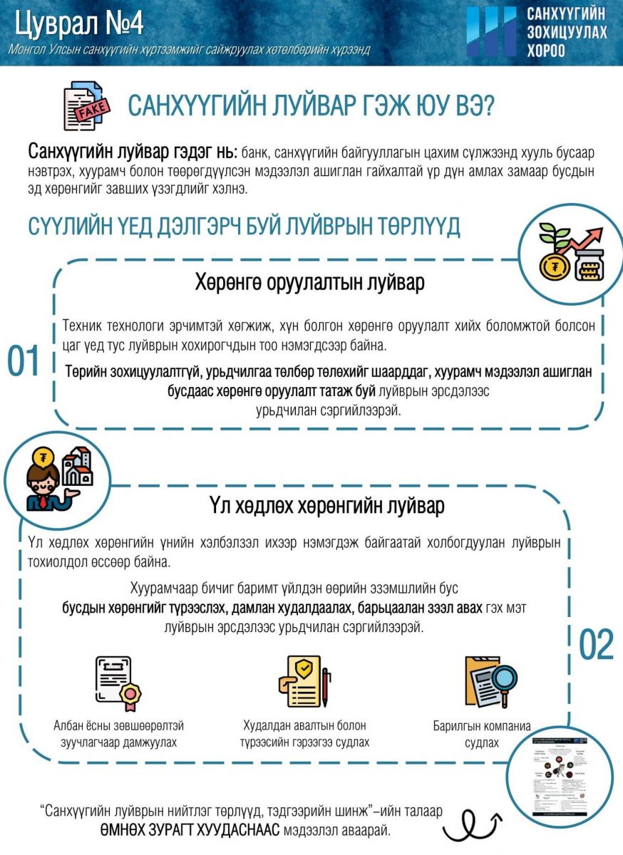 Монгол Улсын санхүүгийн хүртээмжийг сайжруулах хөтөлбөр-ийн дөрөвдүгээр цуврал таны өдөр тутмын ухаалаг зээлийн шийдвэрт зориулсан Санхүүгийн луйвар гэж юу вэ? зурагт хуудсыг танилцуулж байна.