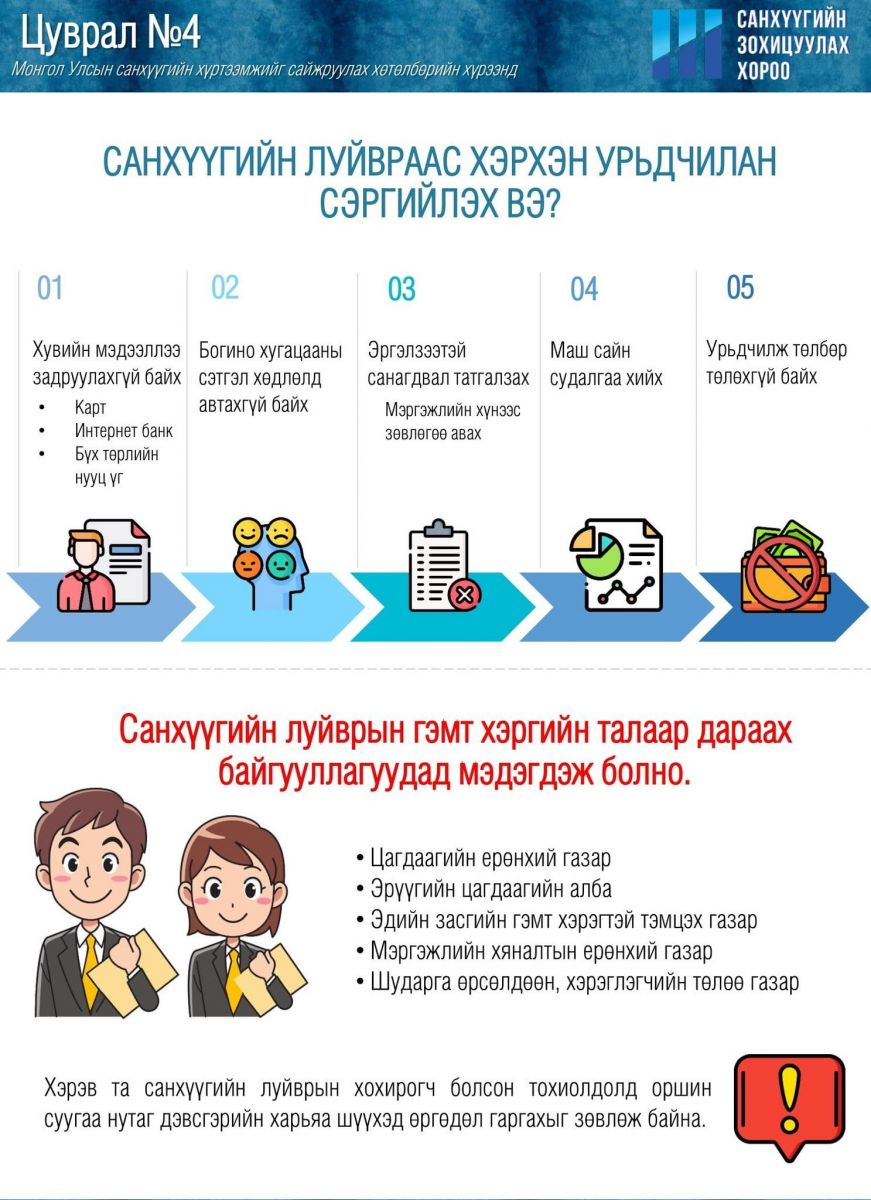 Иймд Санхүүгийн зохицуулах хорооноос эдийн засгийн хүртээмжийг нэмэгдүүлэх хүрээнд Монгол Улсын санхүүгийн хүртээмжийг сайжруулах хөтөлбөр боловсруулсан талаар өмнө нь мэдээлж байсан. Энэхүү хөтөлбөрийн санхүүгийн хэрэглэгчийн түвшин тус бүрийн хэрэгцээ шаардлагад нийцсэн санхүүгийн боловсрол олгох, иргэдийг санхүүгийн залилан, луйвраас урьдчилан сэргийлэх хүрээнд Иргэдийг зээлийн ухаалаг шийдвэр гаргахад нөлөөлөх мэдлэг олгох хөтөлбөрийг боловсруулж, хөтөлбөрийн эхний хэсэг болох зурагт мэдээллийг цувралаар хүргэсээр байна.